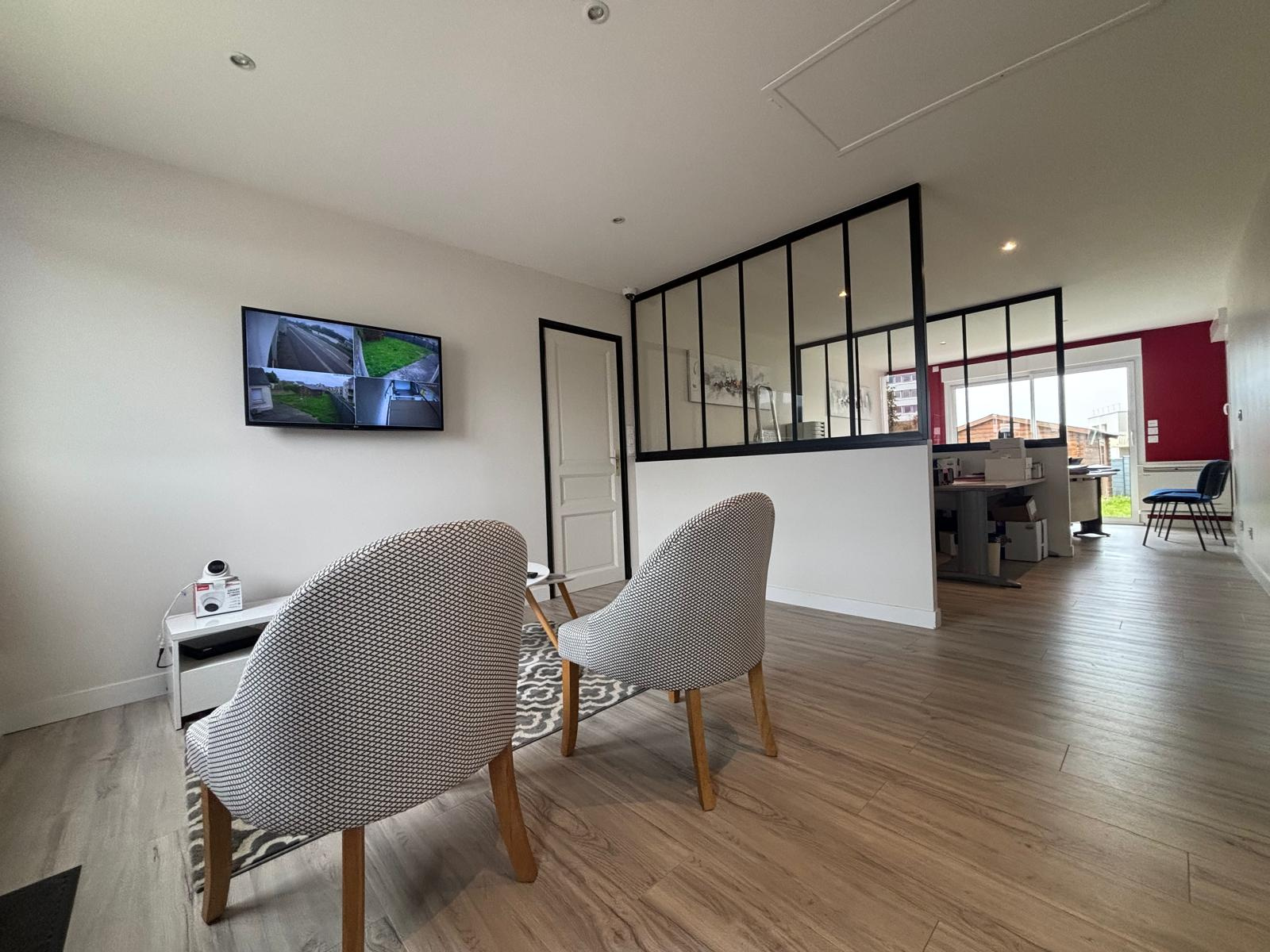 Le local comprend un espace accueil, 5 espaces de travail, une salle de pause, un WC, une seconde salle de pause ainsi qu’un garage et un espace de stockage.